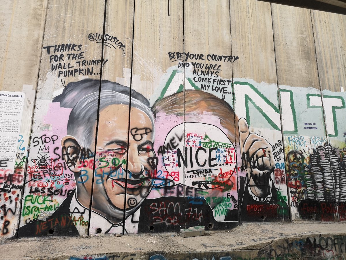 It's become a tourist attraction. All kinds of stores selling grafitti and a hotel called the walled off hotel. It's been one of my favorite things I've seen here. Trump is already on it.