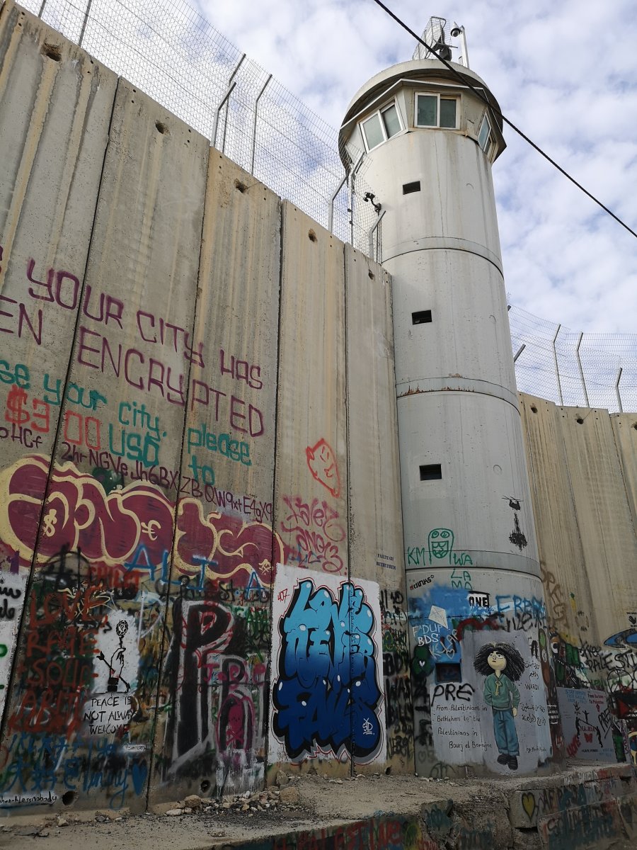 That wall goes for some 300 miles. Enclosed the whole west bank. It's pretty impressive. Goes right between Bethlehem and Jerusalem.