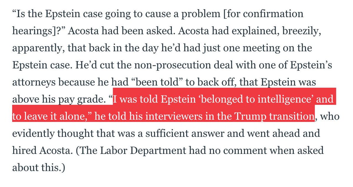 Hardcore troubadour 15,908 Posted July 11, 2019 6 hours ago, Filthy Fernadez said: https://pbs.twimg.com/media/D_IdK1VXUAI45cu.jpg Acosta told it "was above his pay grade" That's the AG or perhaps national intelligence? Share this post Link to post Share on other sites